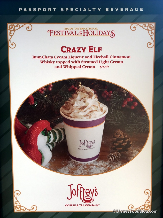 - Crazy Elf: RumChata® Cream Liqueur and Fireball Cinnamon Whisky topped with Steamed Light Cream and Whipped Cream – $9.49