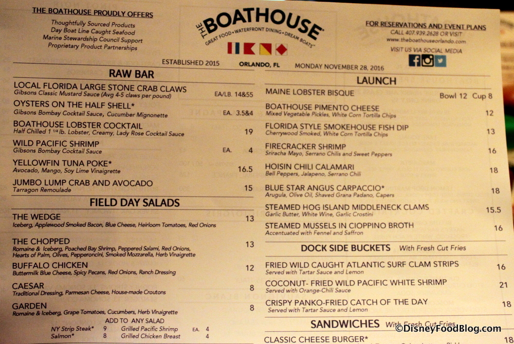 Raw Bar items appear at the top left, and you’ll also find Salads and Appetizers (“Launch”). There were also Dock Side Buckets, which are fried items served with French Fries on the side.