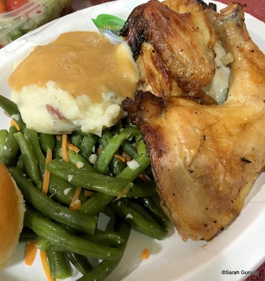 My husband and I shared this meal, subbing for some cold vegetable sides from the grab-and-go. You can see those garlicky green beans more clearly here. Instead of the nondescript corn, we opted for mashed potatoes. These were average but, like the turkey the night before, benefited from a good dose of gravy. The chicken was moist but bland. You can see it has some nice color, but we weren’t impressed by the flavor.