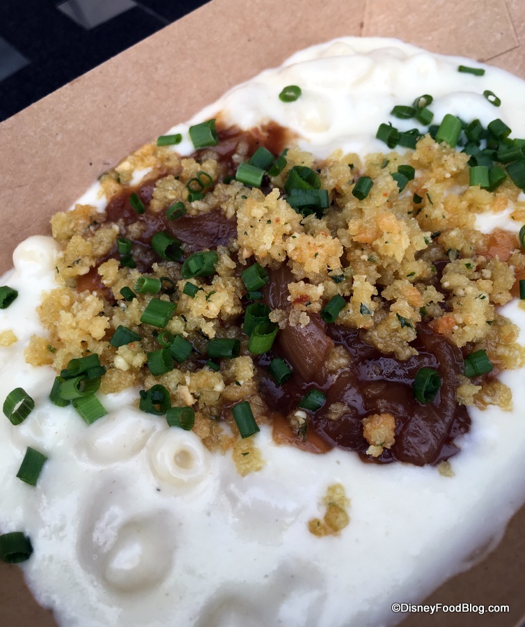Next, we arrive at our second Mac and Cheese item of the day, the French Onion Mac and Cheese at the Onion Lair. Super saucy Mac and Cheese is topped with Caramelized Onions, Parmesan Crumble, and Chives.