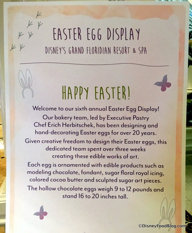 As a note, a sign in the Grand Floridian stated the Eggs would be on display through April 19th; however, according to other information that Disney has presented, they may be on display as long as through the 29th.