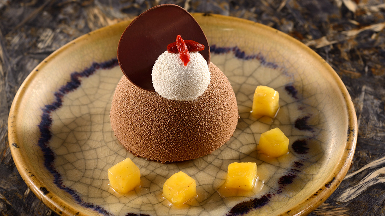 When creating these desserts, Disney chefs took inspiration from the Na’vi of Pandora. The first dessert – Blueberry Cheesecake with Passion Fruit Curd – uses the Na’vi colors of blue and yellow and features passion fruit as a connection to the tropical environment of Pandora.