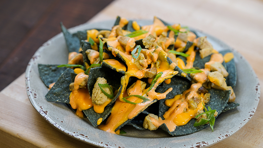 - Obviously Nachos – Fried blue corn tortillas with red pepper cheese sauce, mojo-marinated chicken, chipotle crèma and green onions (vegetarian version also available)