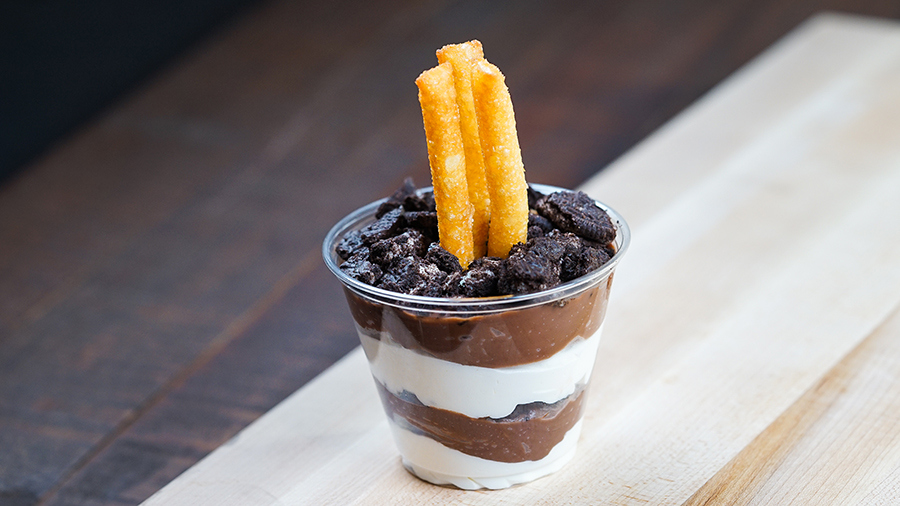 - Angry Little Pudding Cup with chocolate pudding, chocolate sandwich cookies, whipped cream and funnel cake fries