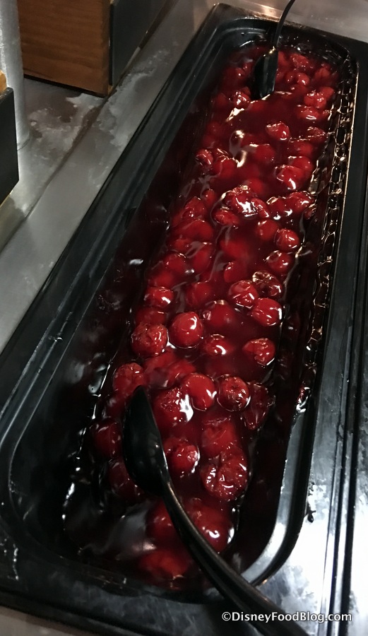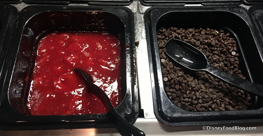The sauces are, indeed, some pretty sweet selections. But you can also take your already topped waffle OVER the top with some finishing touches like strawberries or chocolate chips.