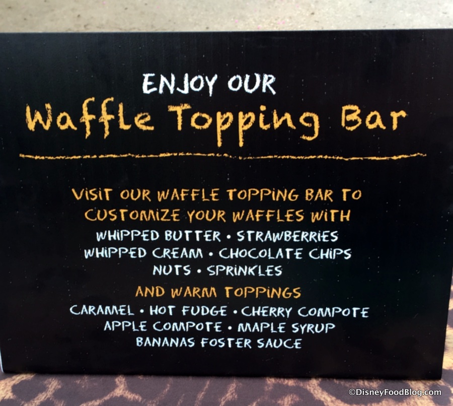And if you are visiting Animal Kingdom now through June 10th, you are DEFINITELY going to want to know about the Dino-Sized Breakfast options, featuring Mickey Waffles complete with a Waffle Topping Bar! What?! I KNOW!!