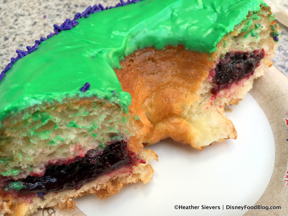 Bright green icing and purple sprinkles make the Gamma Sized Doughnut an eye-catching snack (don’t worry — the icing is standard vanilla despite its psychedelic color!). And the inside is a pretty neat too! There is a thick layer of Blackberry-Black Currant Jam stuffed into this baby!
