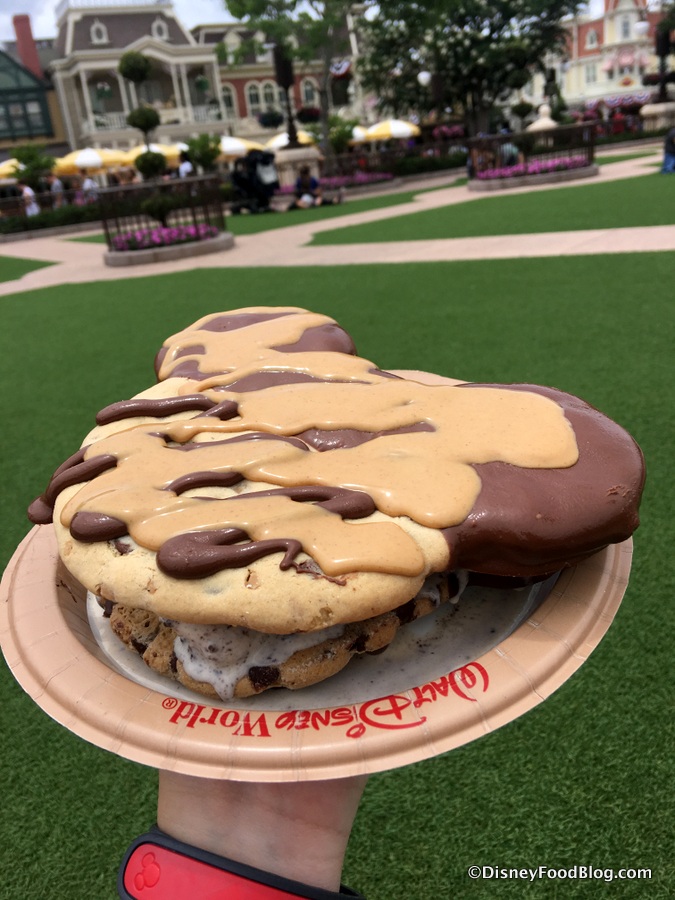 The Mickey Chocolate Chip Cookie Ice Cream Sandwich With Peanut Butter Sauce is one of our favorite Disney food hacks ever!