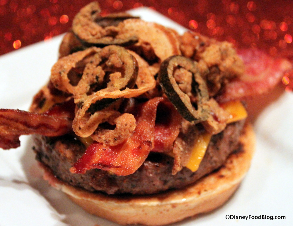 But check out this cross-section, with the Sci-Fi signature blend of beef which makes up the burger. This is NOT, thankfully, your typical well-done-to-the-point-of-dry Disney burger. Nope. And here’s WHY: The current chef at Sci-Fi recently came over from D-Luxe Burger in Disney Springs! So the Sci-Fi burger uses the same proprietary blend of beef that’s used at D-Luxe…which is amazingly delicious. And they KNOW not to cook burgers to within an inch of their lives. So YAY for burger rejuvenation here!