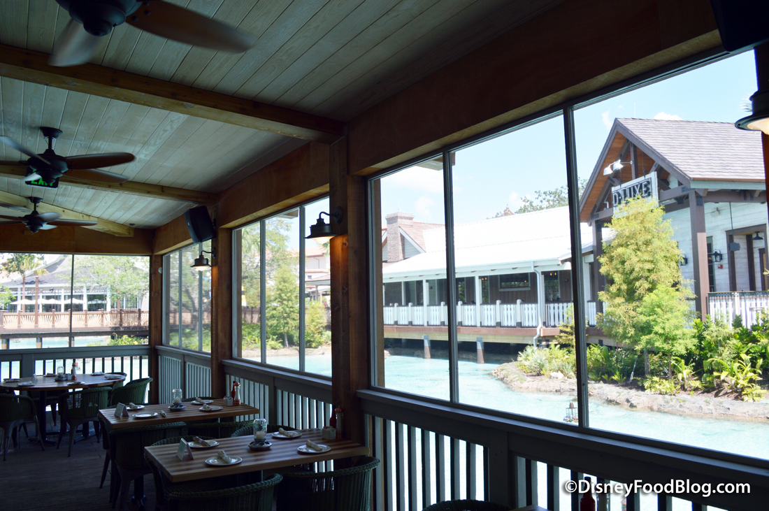 A porch to one side overlooks the newly renovated Disney Springs.