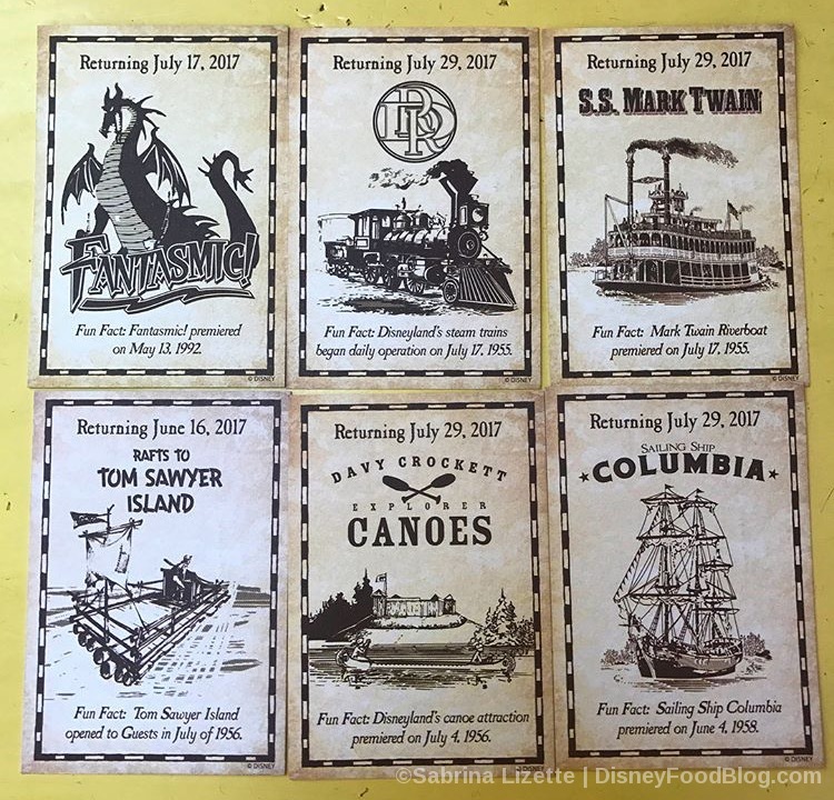 The cards commemorate six different Rivers of America-related attractions. And each card has both the premier dates of the attraction as well as its return date. So you get a little history of Disneyland with your free (yes, free!) souvenirs! We dig the vintage-looking black and white images.