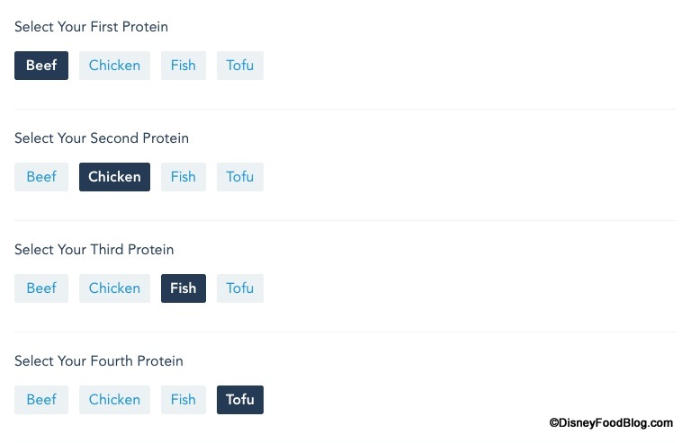 If you’re choosing to utilize Mobile Order, you’ll see your protein choices listed for easy selection. Beef, Chicken, Fish, and Tofu are the options, just like with a regular solo entrée order of the Satu’li Customizable Bowls.