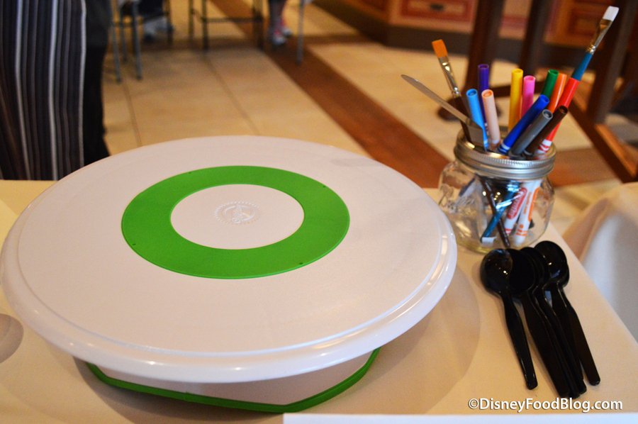 Upon each table were name cards, gloves, a cake spinner, and painting brushes, along with some of the edible components we’d later be placing on the cakes.