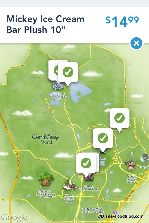 … you’ll also find him coming up in Disney WORLD, too — at least, per the app’s Map function (just FYI: we haven’t verified this in person yet). When you select “Find on Map” via the app, you can hone in on different areas to search out your Dole Whip Plush in Disney World.
