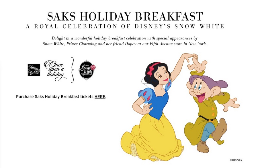 Why?? Because Saks Fifth Avenue will be hosting the Saks Holiday Breakfast CHARACTER MEAL: A Royal Celebration of Disney’s Snow White in honor of the 80th Anniversary of the film Snow White and the Seven Dwarfs.