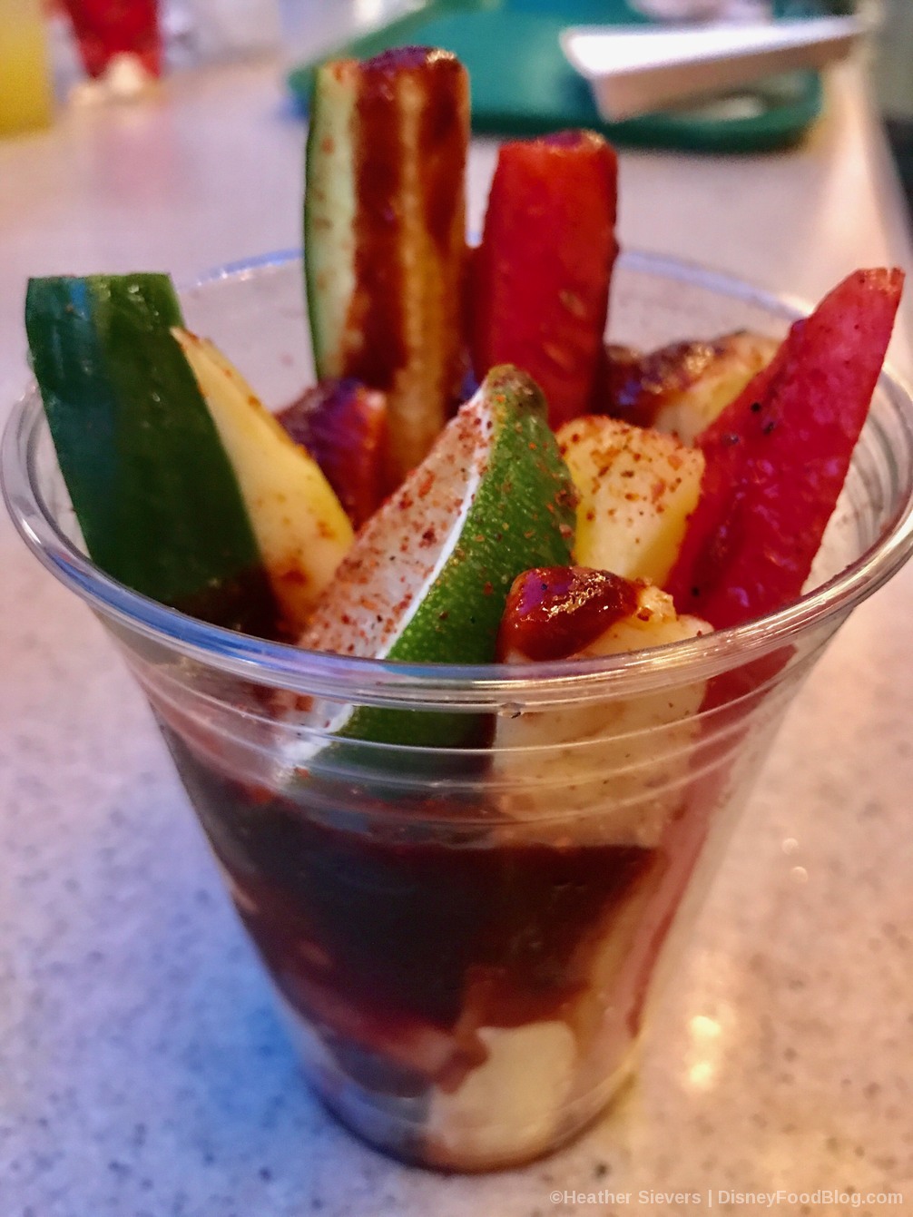 The Ensalada de Frutas is seasoned with chili-lime salt and chamoy (which is basically pickling juice). The fruits include jicama, watermelon, mango, lime, and cucumber. Spicy fruit-flavored foods are popping up around Disneyland, and this is a tasty addition to that repertoire.