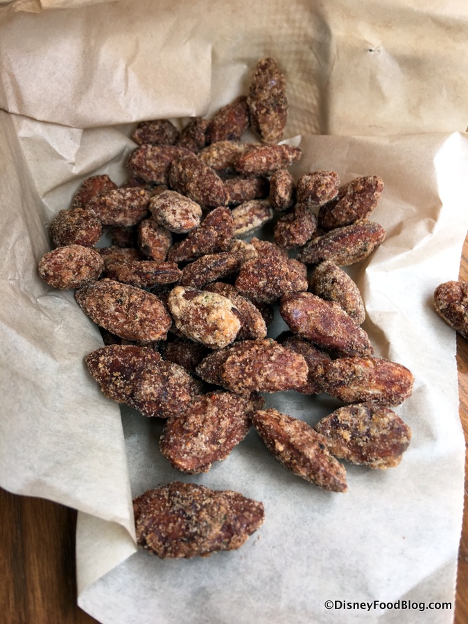 The Spiced Almonds are somewhat atypical than the cinnamon-glazed style you’ll usually find around the parks, as they are both sweet and spicy.