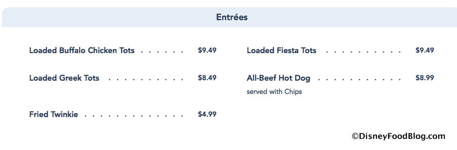 The new menu of Loaded Tater Tots features Loaded Buffalo Chicken Tots, Loaded Greek Tots, and Loaded Fiesta Tots. PLUS a Fried Twinkie to follow up the Tots! It appeared on the Disney World website briefly this week.