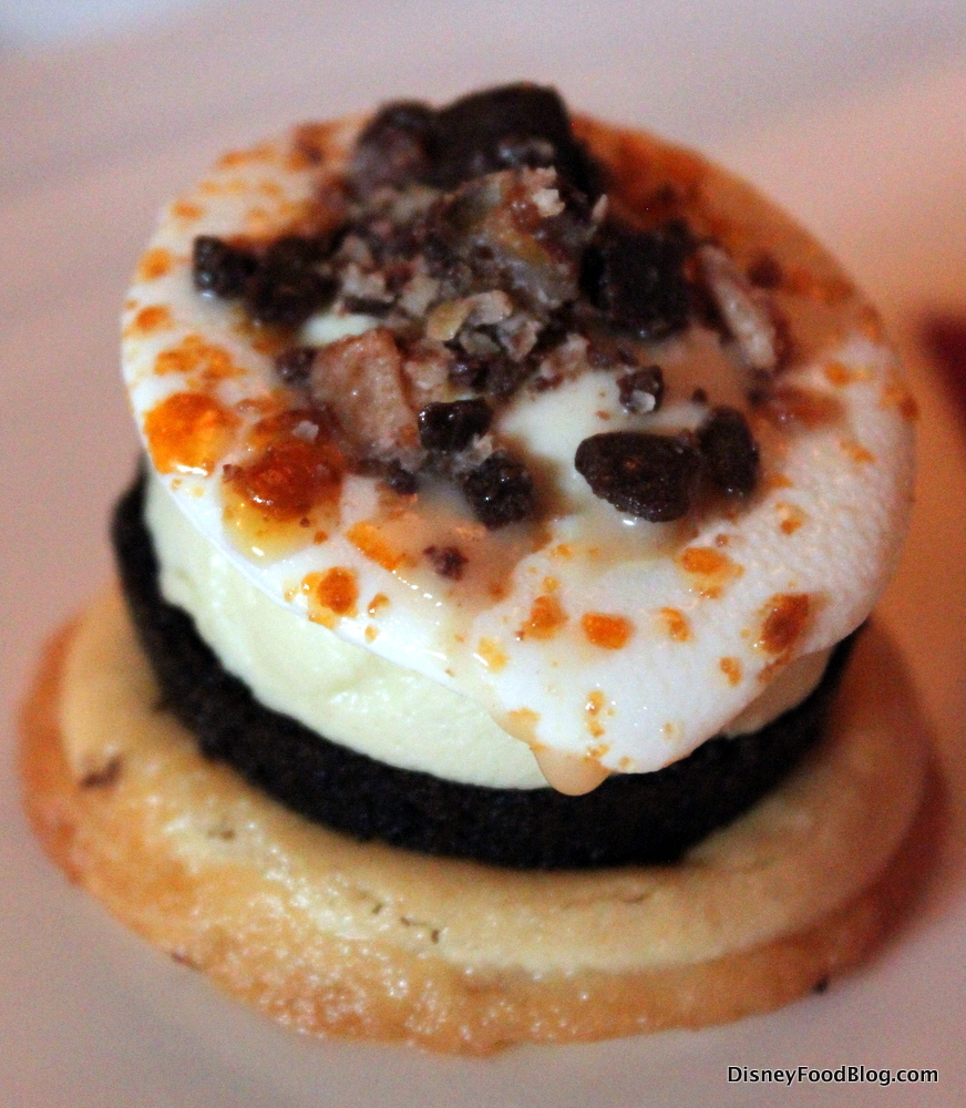 Each two-bite dessert offers lots of fancy flavors and tastes. An up-close photo of the Banana Toffee Cake shows the detail of the French macaron base, cake, banana mousse, and Bananas Foster sauce. The topping of cocoa crunch and toffee bits added some nice texture. This one was fine, but forgettable.