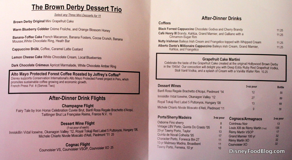 Just ate at Brown Derby last week; these items weren’t on it, so I’m presuming this is an older review. In any case, this was one of my best meals yet (we usually eat here when we’re at Disney). This time I had the veal, which was amazing. Others at the table had the filet (also great – not as great a my veal ;-)) and the pork chop was strong as well. Our table oenophile thought the wine list was top notch. I’m a bit sad no one got the Cobb salad (which they rightfully point out when you make it at home it’s never the same). Great restaurant, likely my fave at WDW.
