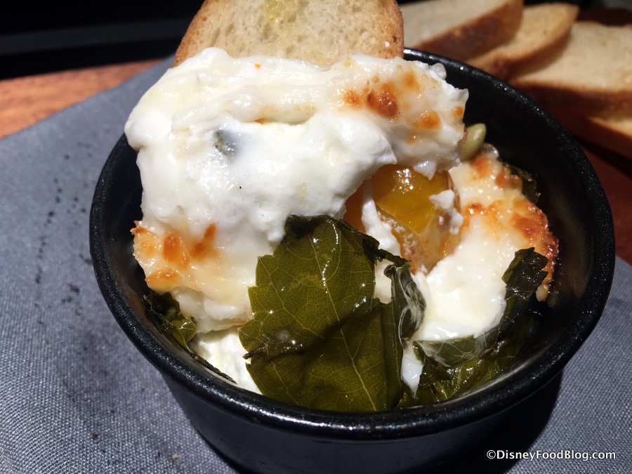 Honestly, it’s hard to really enjoy the grape leaf on the bottom of the bowl since it’s hard to get to through all of that cheese, but the added flavor from the roasted seeds is a really nice touch. Because it’s so rich, this dish could stand on its own. But again, it’s nice for sharing if you’re enjoying the plate alongside… oh, say, the Parker House Rolls and Spreads.