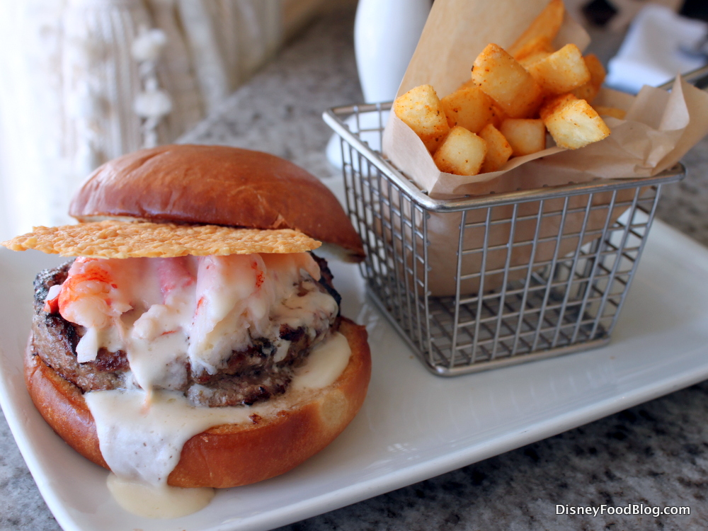 But while we’re here, let’s dig into some lunch, too! I went with the Lobster Thermidor Burger. The Grand Floridian Cafe has always had some variation of a lobster-topped burger on the menu, from the Grand Floridian Burger to the Surf and Turf Burger. And — no joke — they’ve all been worth getting. But the current Lobster Thermidor Burger…