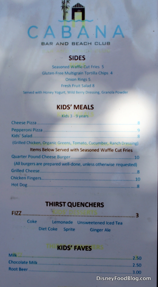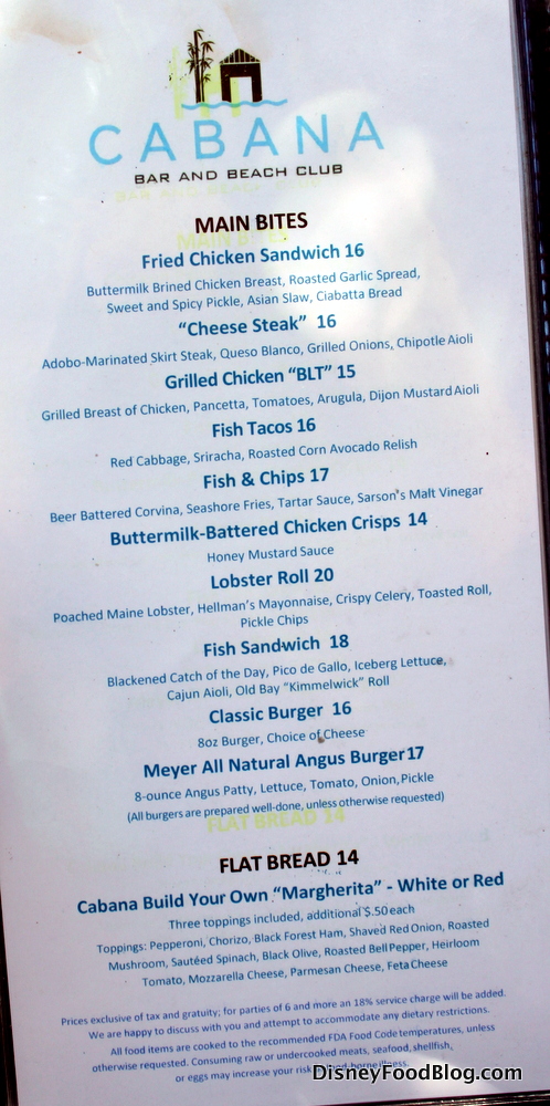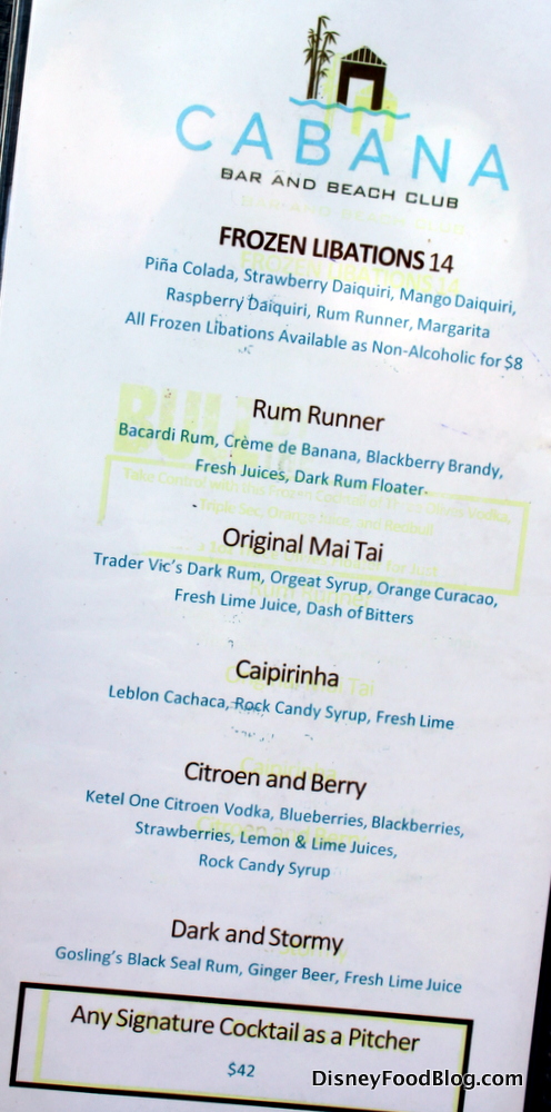 Cabana Bar and Beach Club (not to be confused with Banana Cabana at Caribbean Beach Resort or Cabanas on board the Disney Cruise Line ships) boasts a surprisingly huge menu (several pages long!). You’ll want to start with the Cocktails, which are cleverly named… and generously poured. 😉