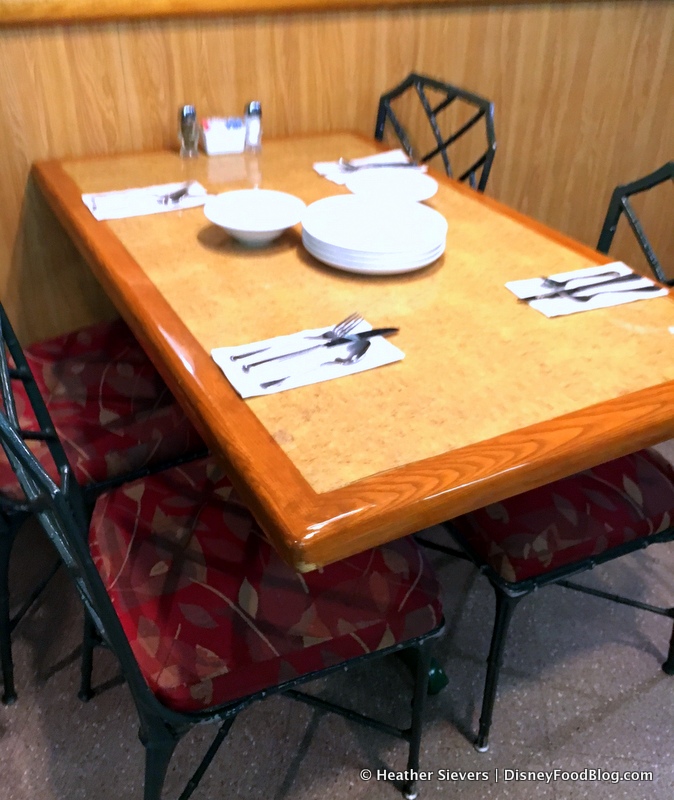 Rachel – We had 5 adults and a 3 year old in the large booth and it was tight. As a party of 2, we have been sat at the little end of a “booth” with a group of 6-8 taking up the other side. I’m sure you’ll have no problem fitting into one of those (and it’s on the lower level with the best views). The tables on the higher level are easier if you have kids though (for them to get up and hug/meet the characters) or if they say at the ends of the booth.