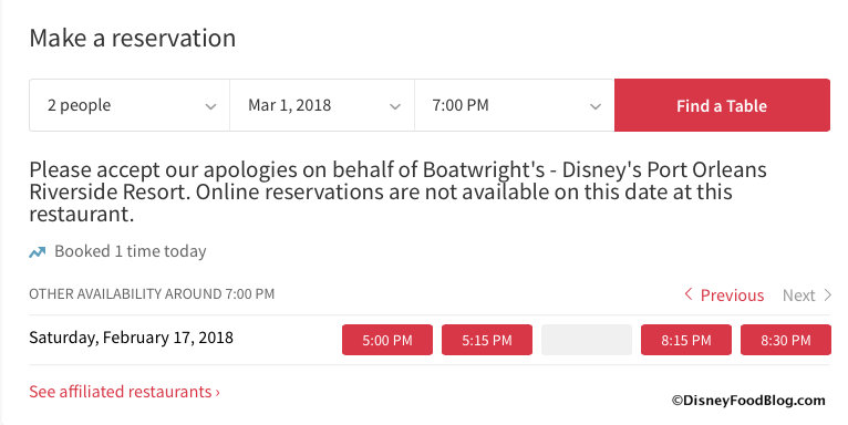 Another difference is that you will not find the same 180 day booking window for reservations made through Disney. In attempting to book Boatwright’s via OpenTable on December 21st, for instance, the furthest out we could make a reservation was for February 28, 2018.