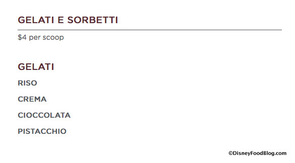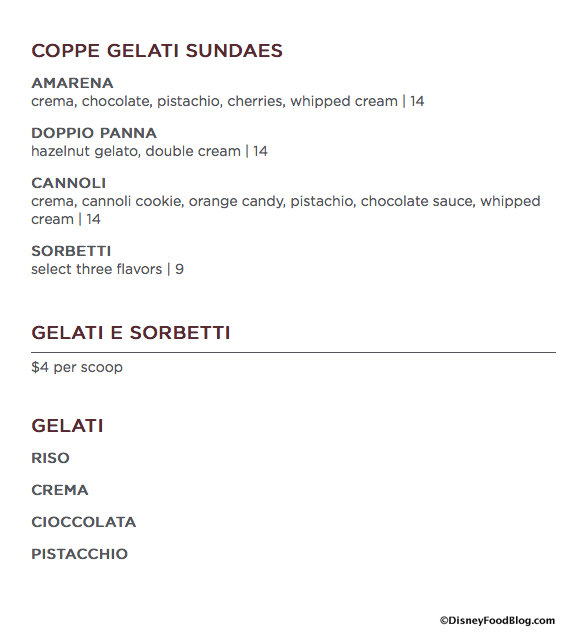 For Desserts, Gelato and Sorbet can be ordered by the scoop or as part of Coppe Gelati Sundaes.