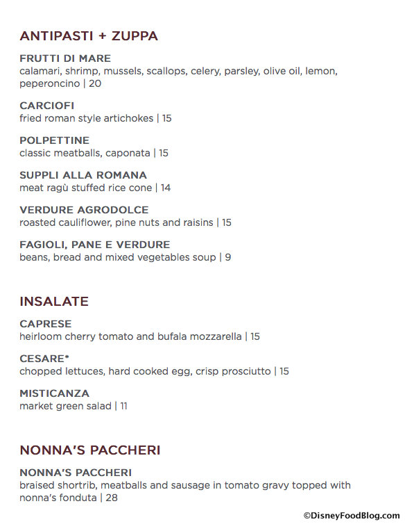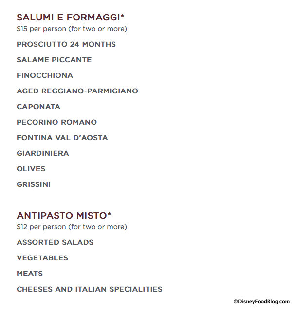 The Dolce Vita options change in price for dinner, with the Salumi e Formaggi at $17 per guest, and the Antipasto Misto coming to $14 per guest.