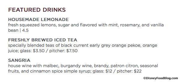 Featured Drinks outside of bar options during both lunch and dinner are a Housemade Lemonade, Iced Tea, and Sangria.