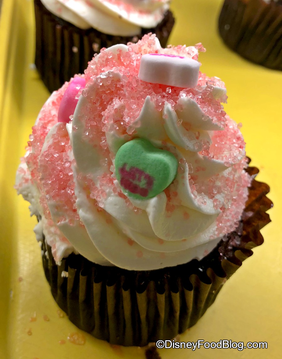The Candy Hearts Cupcake is a pretty, sugary seasonal option in the dessert case here.