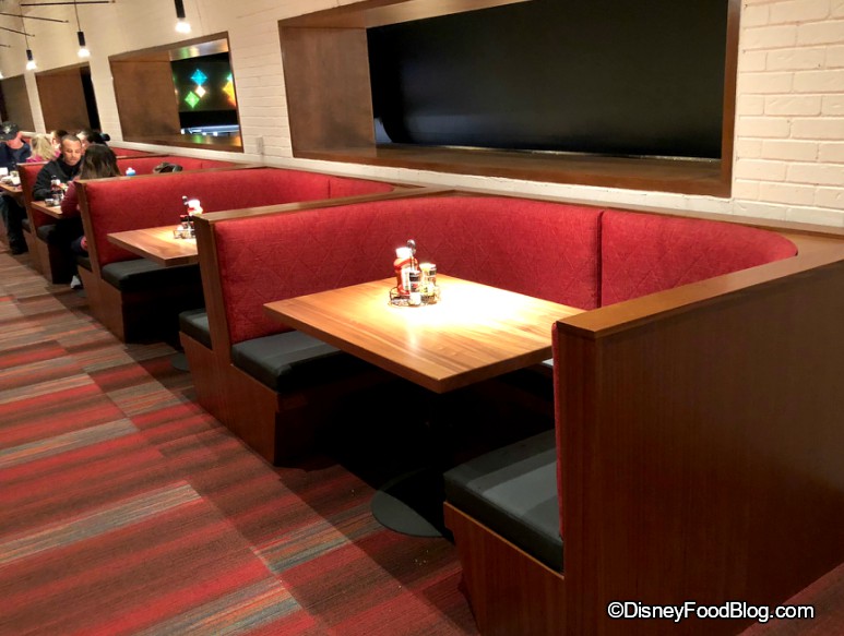 Nope — time to eat! 😉 Disneyland Splitsville has loads of seating for guests dining here. There are tables with chairs (in a sort of mid-century style) as well as booths. And this second-floor dining area provides awesome views of Downtown Disney, too!