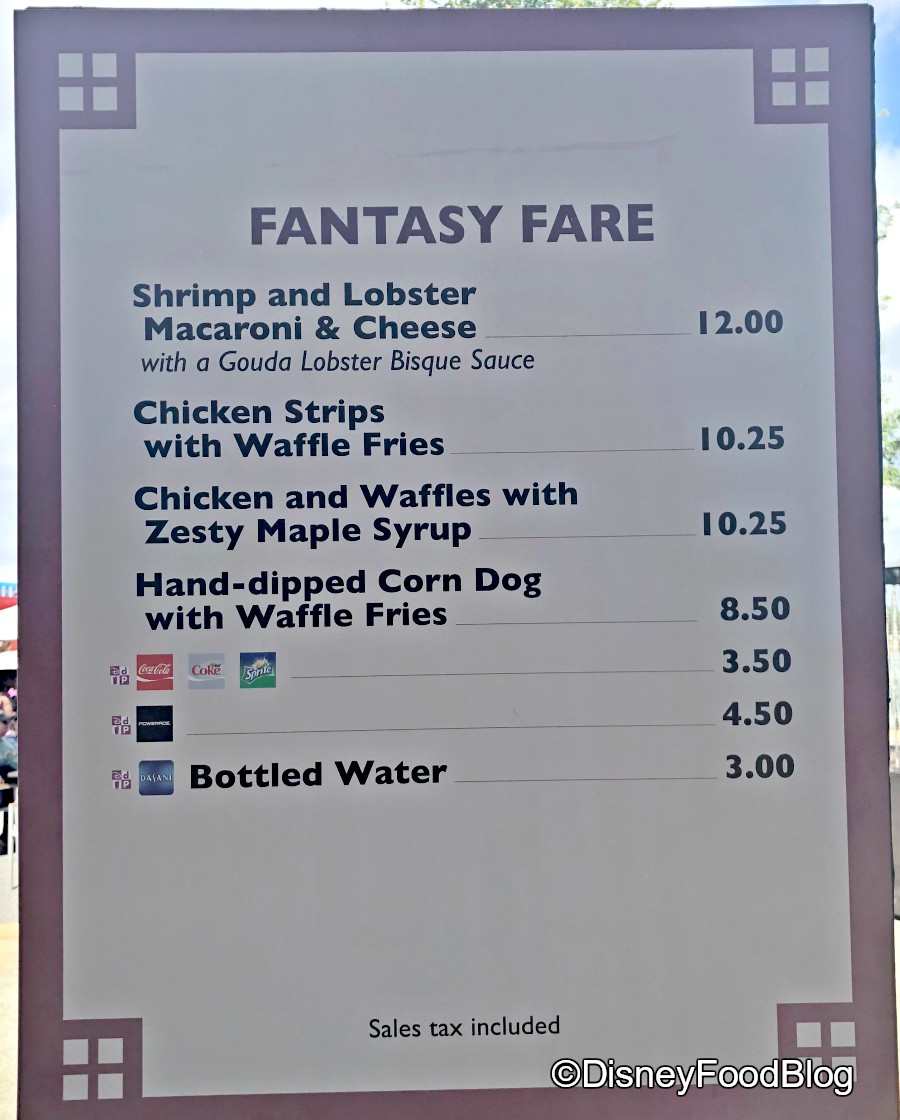The current food truck in West Side is Fantasy Fare, which is serving up Shrimp and Lobster Mac and Cheese, Chicken Strips with Waffle Fries, Chicken and Waffles, and Hand-Dipped Corn Dogs. The hand-dipped corn dogs are the same as what we’ve reviewed before here at Fantasy Fare, but the chicken and waffles have gotten an update!
