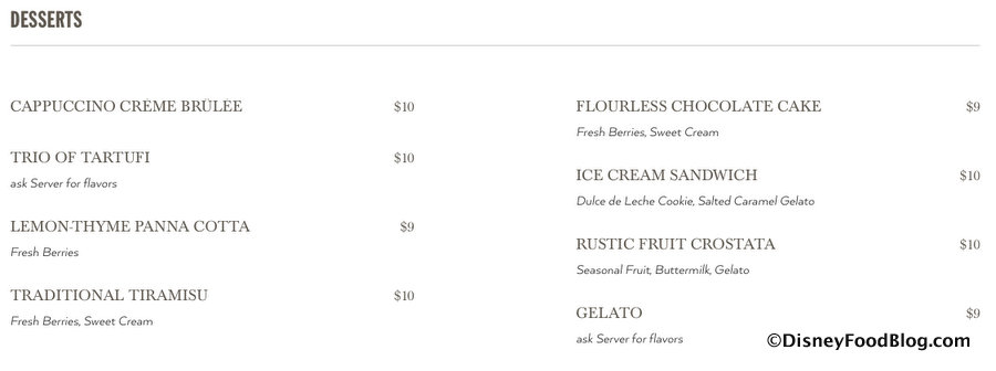 UPDATE: Though the screenshot below does not display the popular Biramisu on the Dessert menu, it is currently coming up as an option on the menu via the Disney World website.