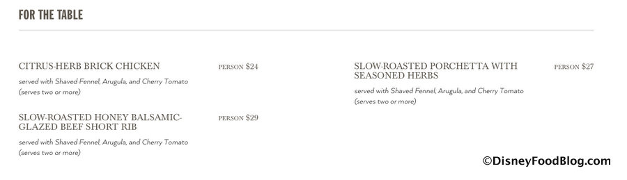 A few family-style options “For the Table” are priced per participating guest, and include Slow-Roasted Honey Balsamic-Glazed Beef Short Rib.