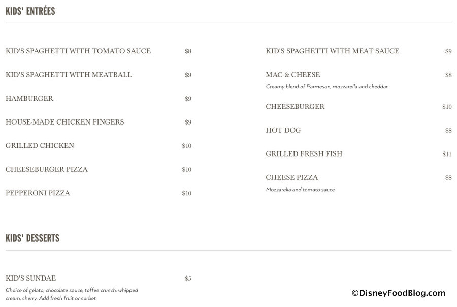 What an attractive menu! If it gets reasonable reviews I would be willing to try it, even with my selective eaters. But I have to say I’m starting to feel like we should call Disney “Little Italy South.” How about some other cuisines? I’d love to see a pho quick service, maybe a real kabob place or a diner that serves breakfast all day and pie? As much as I love Italian (I’m from NJ) I’d still like to see more variety.