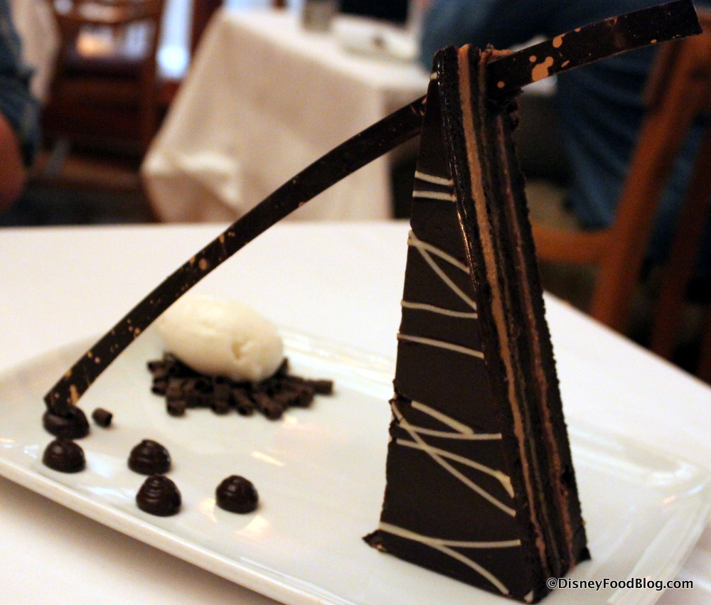 The day’s no-sugar-added Carrot Cake was a total bust — despite being plated beautifully. The too-dense cake has a Cheesecake Frosting, and it’s served with Caramel Ice Cream and Walnuts. But it was… not good. Bland and washed out with very little going for it.