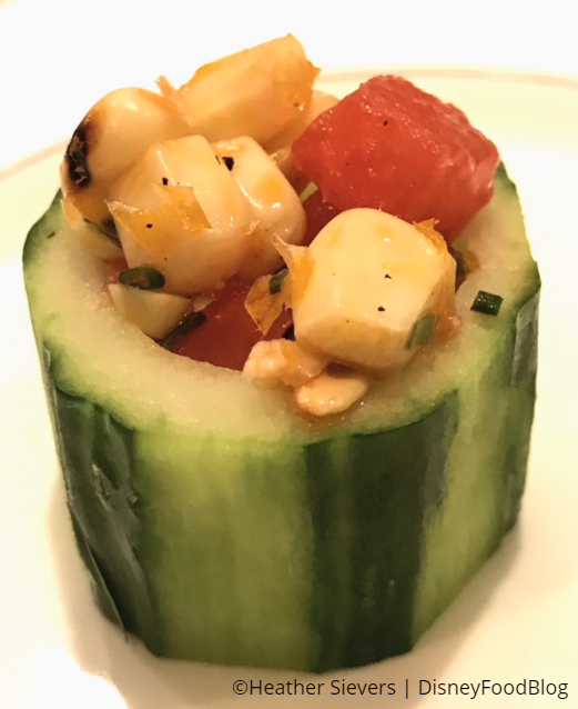 Now the bright blue Deviled Egg… tastes terrific. If you can get past that color, of course! But the color is necessary because this one recreates the iconic Pixar ball! Topped with caviar, this is an upscale deviled egg done in a fun way. (So we scraped off the caviar because it’s just not for us, and it was still tasty!)