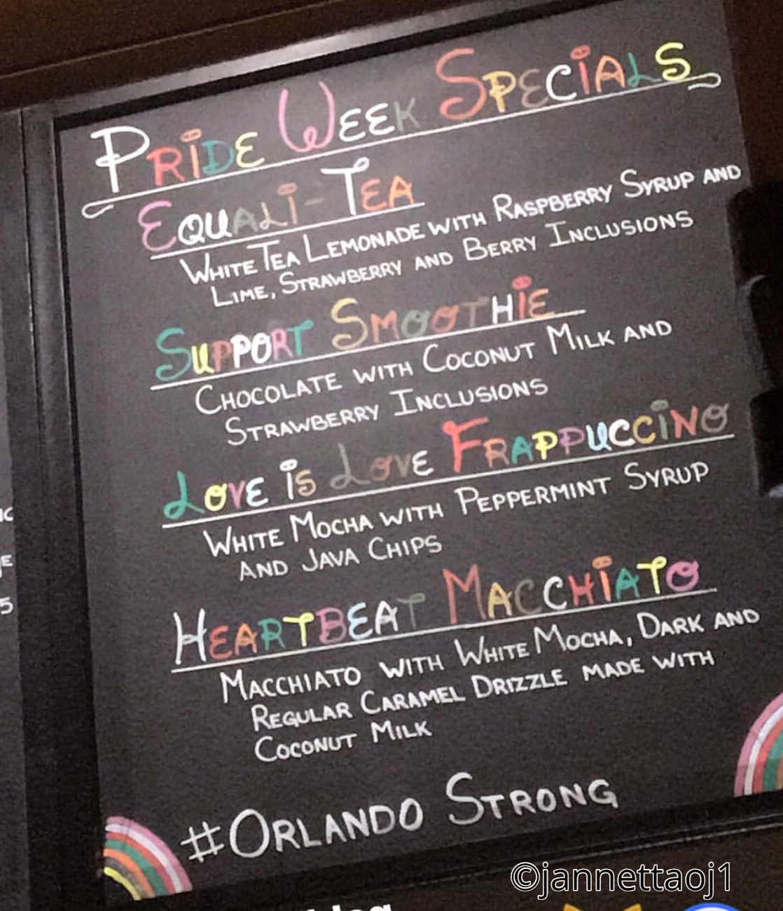 Thanks to @jannettaoj1‘s tag on Instagram, we also got a peak at the Disney Springs Starbucks‘ menu for this month, featuring Equali-Tea, Support Smoothies, Love is Love Frappuccino, and Heartbeat Macchiato!
