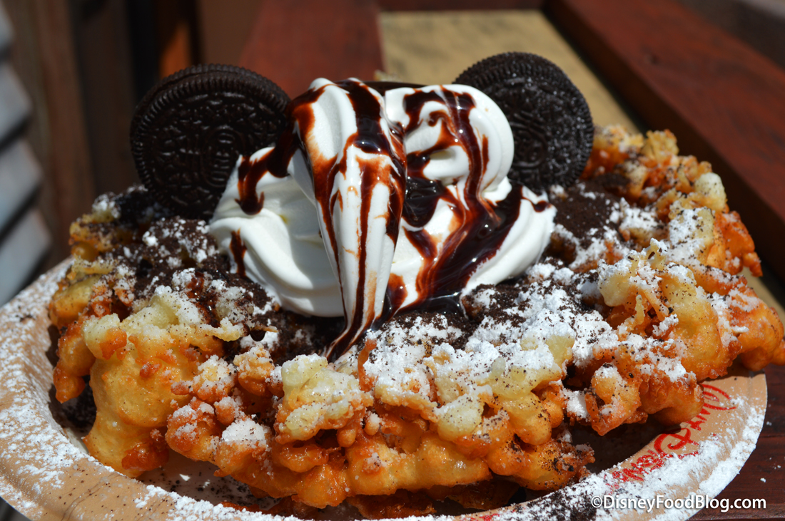 Yeah, we love a funnel cake — and we love a funnel cake with cool toppings even more! We’ve seen a Cookies and Cream Funnel Cake at Epcot in the past — remember that slab of ice cream that looked like butter?