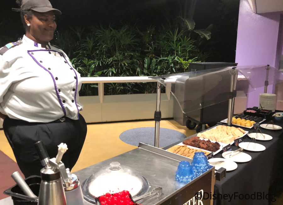 A cast member (YAY NENE!) is on hand to help scoop up ice cream for you at the Create Your Own Sundae station.