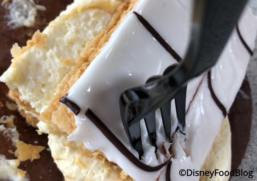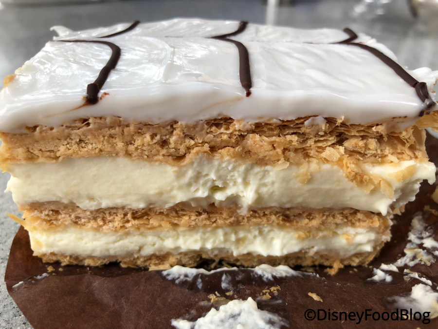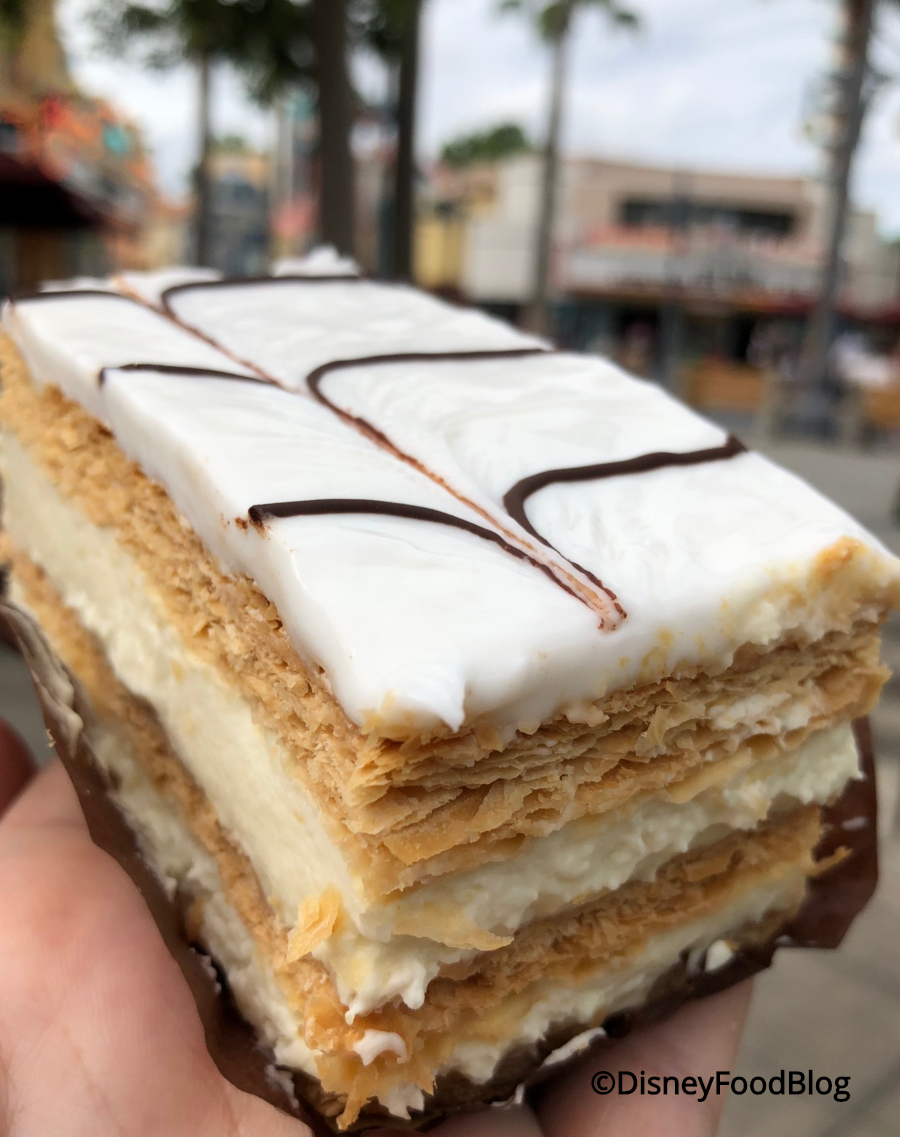 But the Peanut Butter Cupcake is the same favorite we’ve always loved! Trolley Car Café also carries some classics — not just Disney classics but actual pastry classics. Like the Napoleon! Napoleons are a staple in the pastry world. Comprised of three layers of puff pastry (often baked between two baking sheets to get that thin, flaky profile), rich vanilla pastry cream, and topped with royal icing (even more traditionally with something powdered, like sugar or cocoa), the mille-feuille as it’s called in France never fails to impress. Trolley Car tops theirs with the newer tradition of black-and-white glaze, and between those flaky layers of buttery puff pastry and the delicious pastry cream, we honestly love this. It might not be flashy — no characters emblazoned on the top! no white chocolate Olafs popping out! — but it’s awesome. It’s… a little hard to eat, we admit, but accept that you’ll get a little messy, and dig right in! Oh, yeah. We could go for another one right now!Don’t Miss Out on the ALL the Best Snacks Walt Disney World Has to Offer!
