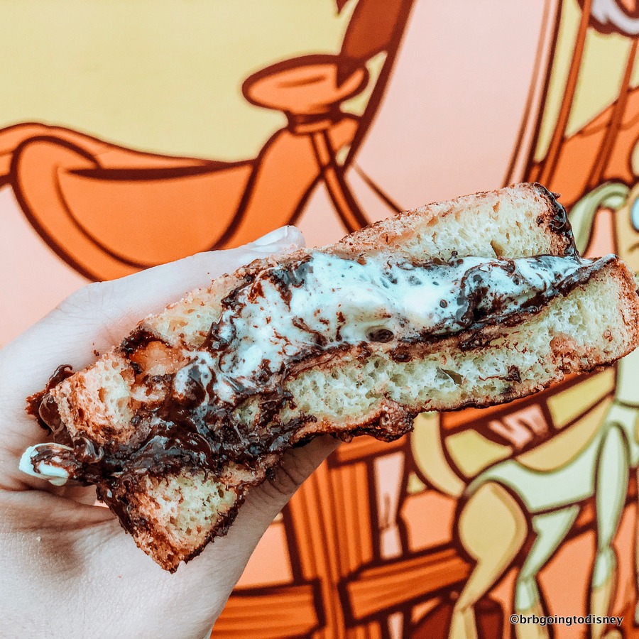 So you’ve got your chocolate and your marshmallow… but where’s that final S’more staple ingredient of graham cracker? Small bits are encrusted on the outside of the sandwich, along with cinnamon and sugar! This might even beat out the Croissant Doughnut (topped with banana-caramel sauce and chocolate ganache) at Be Our Guest Restaurant as the most unapologetic dessert-for-breakfast in Disney World right now!