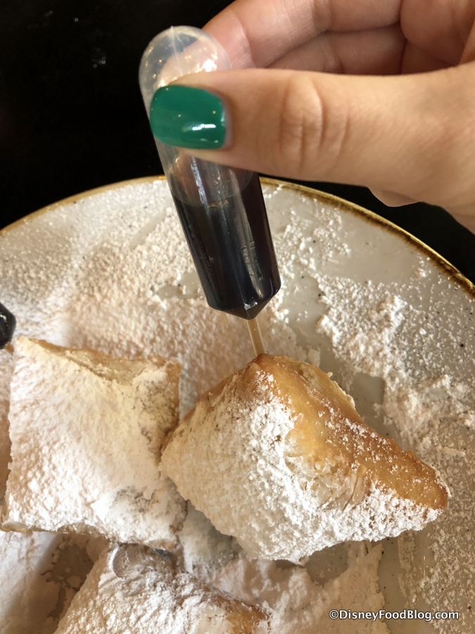 The infusion takes place with the help of pipettes making the most of the hollow Beignets, allowing guests to insert their alcohol of choice into the Beignets. (And, for the record, you can only order one type of alcohol per order as opposed to all three. We tried.)