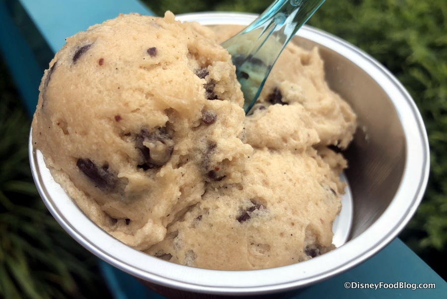 Three small scoops come together to make up a pretty decent sized bowl for $3.99 or a Disney Dining Plan snack credit. And, yes, we did check… this dough is made without eggs, so it’s safe to consume.