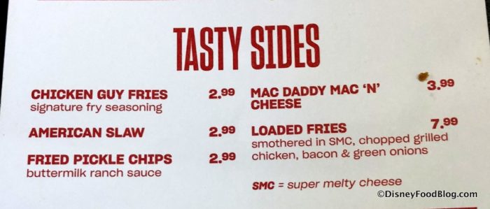 It is still being determined whether Chicken Guy! will accept the Disney Dining Plan. (This is not unusual for non-Disney owned restaurants in the beginning as they work out contracts for new spots, and we’ll let you know here when that is determined.)