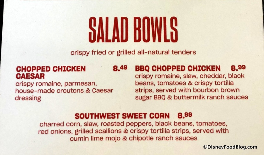 Salad Bowls are also served with your choice of grilled or fried tenders.
