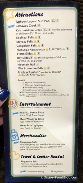 The list also lets you know which attractions are open for the party, where to find party merchandise, and more.